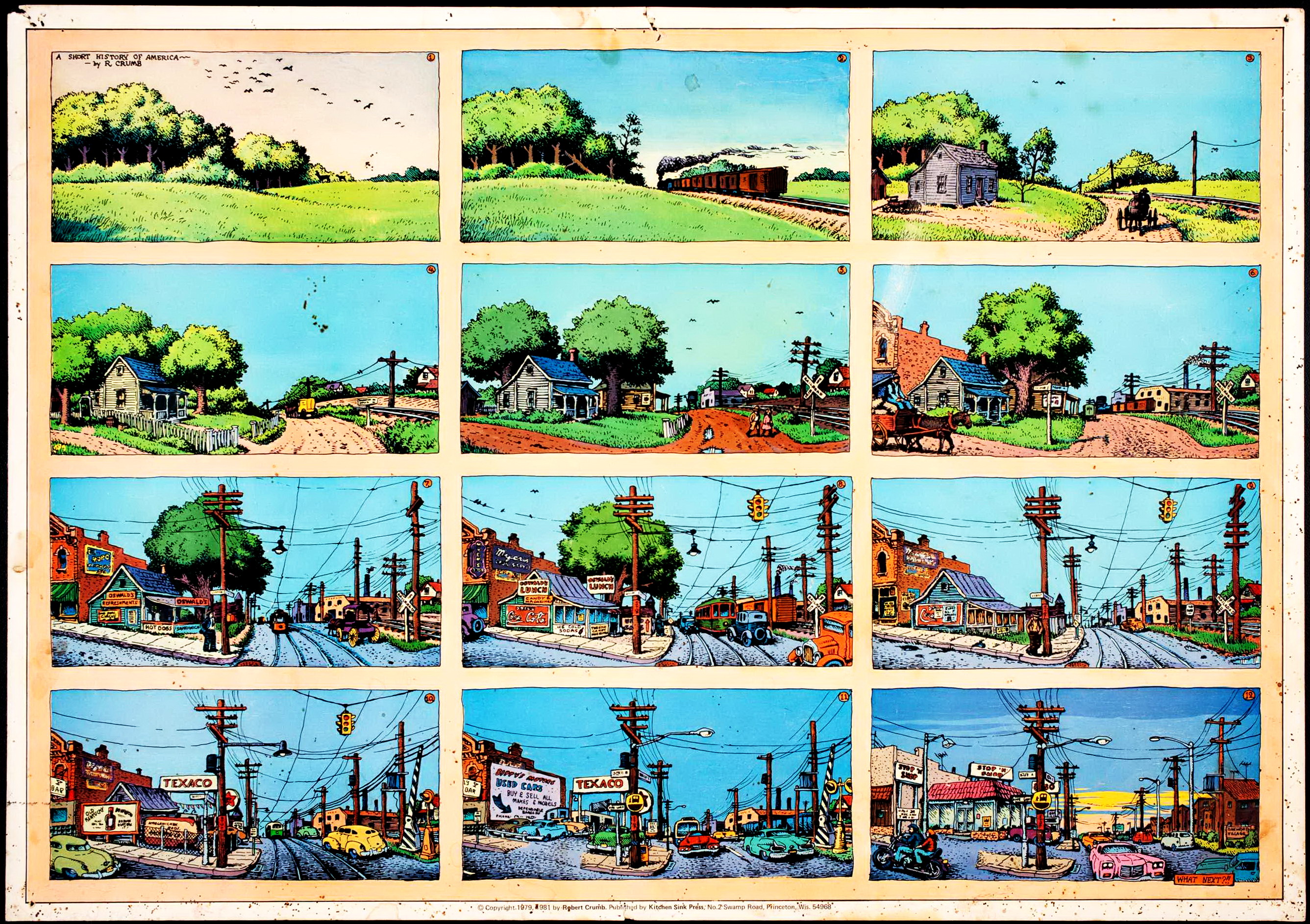 In “Natural’s 719th Meditation” di Robert Crumb, un altro degli autori che hanno ispirato McGuire nella realizzazione di “Qui”, un piccolo uomo con una lunga barba cammina attraverso un deserto, srotola un tappeto, e si siede a meditare. Improvvisamente, di fronte a lui, viene realizzata una strada. Come in un altro racconto in 12 vignette dello stesso Crumb “A Short History of America” (immagine sopra), incominciano a scorrere le macchine, si apre un centro commerciale alle sue spalle, e un poliziotto gli intima di alzarsi e di andarsene. Il piccolo uomo, Mr. Natural, inizia a emettere un suono, “Om”, e gli edifici intorno a lui iniziano a disintegrasi, i venti del deserto portano via tutti i detriti. Mr. Natural si trova nuovamente nel deserto, solo. Esce dalla trance, si allunga, arrotola il tappeto e cammina fischittando fuori dalla vignetta.