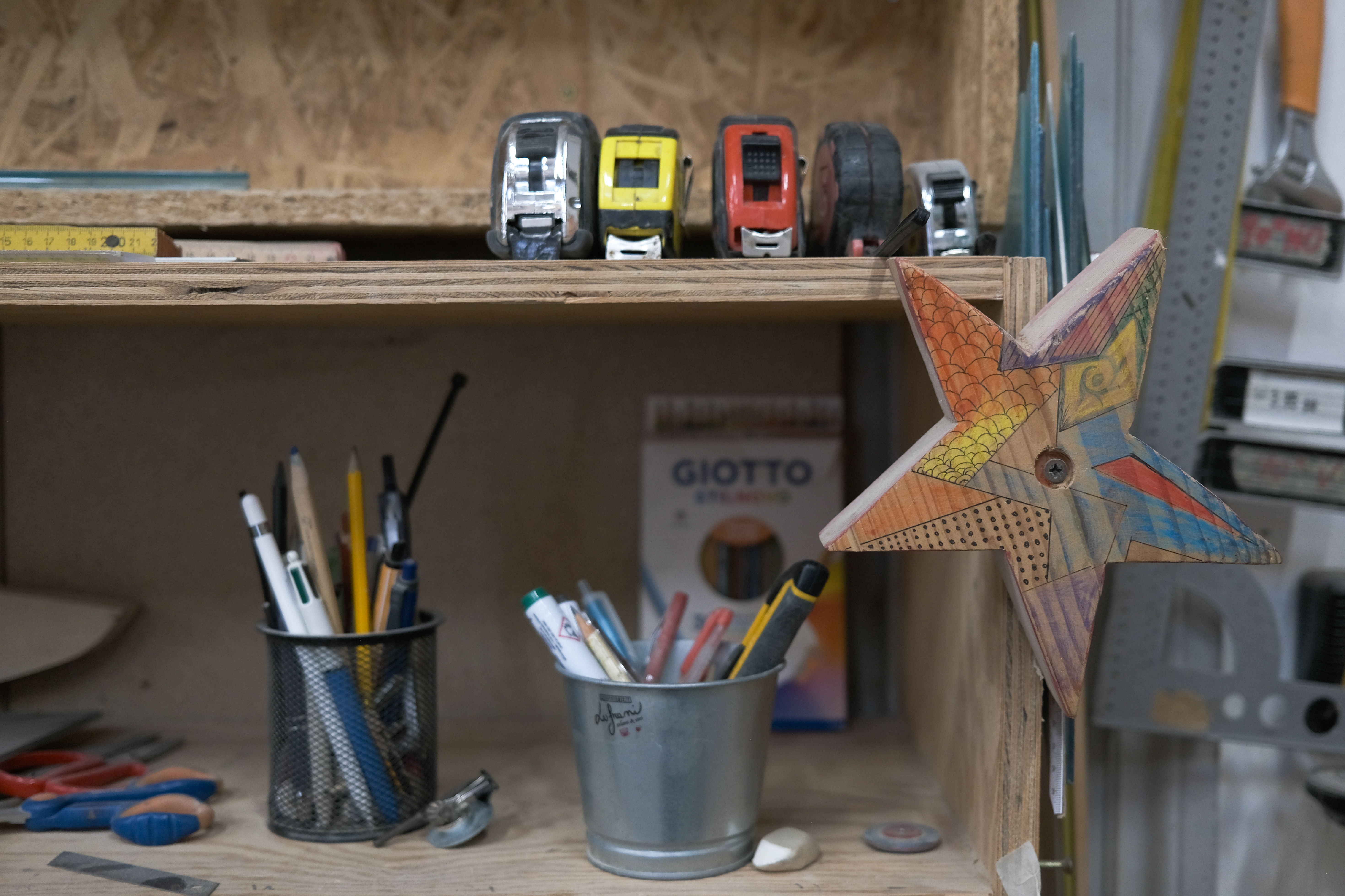 Attualmente, abbiamo quattro falegnami. Due di loro, Giulio ed Andrea,sono in pensione, mentre Edoardo, che lavora ancora, dedica parte del suo tempo al progetto, venendo qui regolarmente il giovedì pomeriggio e in altre occasioni, soprattutto ora che la richiesta di attività è in crescita. Poi c’è Enrico, che il lunedì pomeriggio tiene lezioni di falegnameria. Lui è un maestro di scuola con una grande passione per il legno: da vent’anni, nel tempo libero, si dedica a quest’arte.
