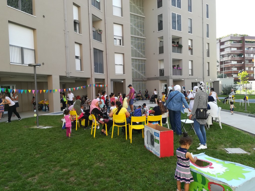 È in quell’esperienza che il nostro modello ha preso una forma più definita. L’accompagnamento si articolava su tre livelli: il supporto individuale alle famiglie, con colloqui, orientamento ai servizi, costruzione della fiducia; la facilitazione delle relazioni tra vicini, con attenzione all’uso degli spazi comuni, alla convivenza, alla mediazione dei conflitti; e infine il lavoro sul territorio, con la costruzione di reti locali, attività comunitarie, dialogo con il quartiere.