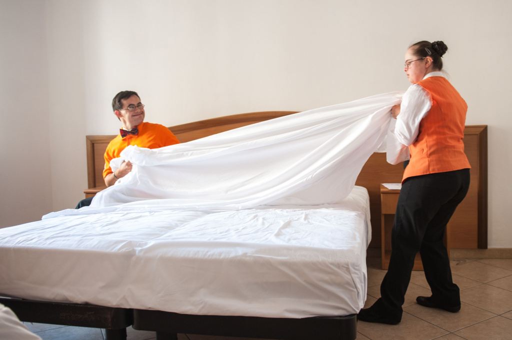 Il secondo asse riguarda l’indipendenza personale. Per noi è fondamentale fornire strumenti che aiutino le persone a vivere in autonomia: imparare a gestire una camera, vestirsi, cucinare, organizzare i propri spazi. Non è un dettaglio. È il cuore di Albergo Etico: perché l’albergo è, simbolicamente e concretamente, una casa. È il luogo in cui si impara non solo un mestiere, ma una modalità di vita indipendente. Il terzo pilastro è l’inserimento lavorativo. Ma attenzione: per noi l’inserimento lavorativo non funziona se prima non ci sono stati quei due passaggi, se la persona non ha acquisito un grado minimo di autonomia e non è stata formata in modo adeguato.