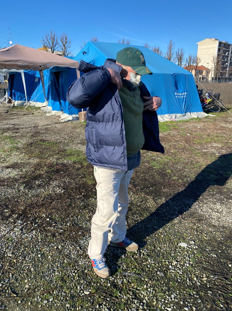 Il giorno dopo torniamo alle Tende e incontriamo di nuovo Ernest, nome di fantasia: lui si chiama Eugène Alsteen. Ha un abbigliamento e condizioni del tutto non idonei per vivere in strada. Ci racconta di aver perso documenti e tutto il resto, di arrivare dal Belgio, da Waterloo, e di avere l’auto rotta e ferma da qualche parte, forse a Milano.